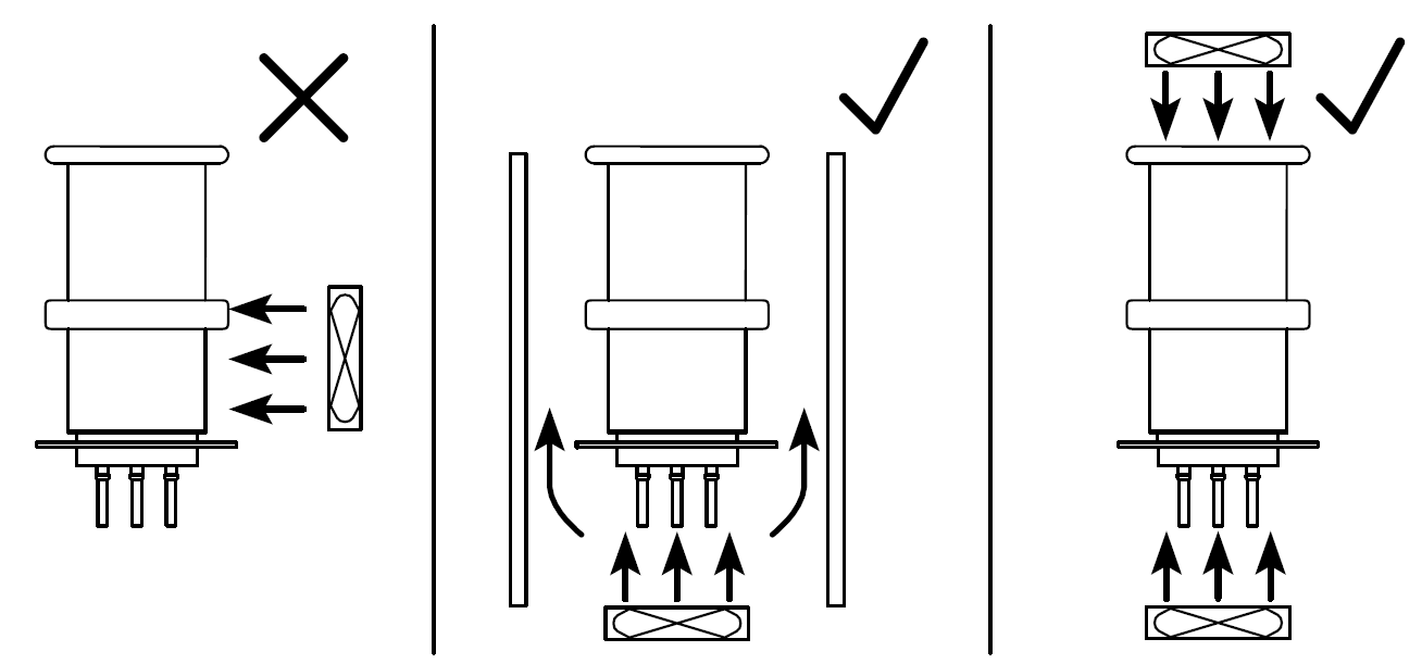 [9] 强迫风冷时,要求风扇流量不小于2.83m3/min ,准确风机安装参考下图后两种方式。