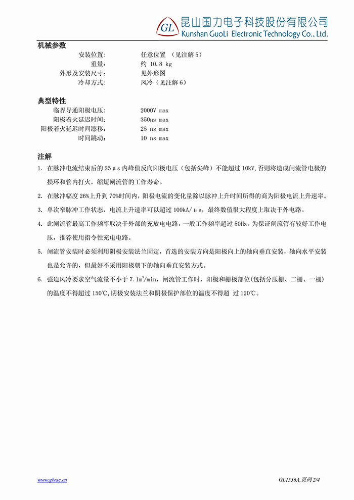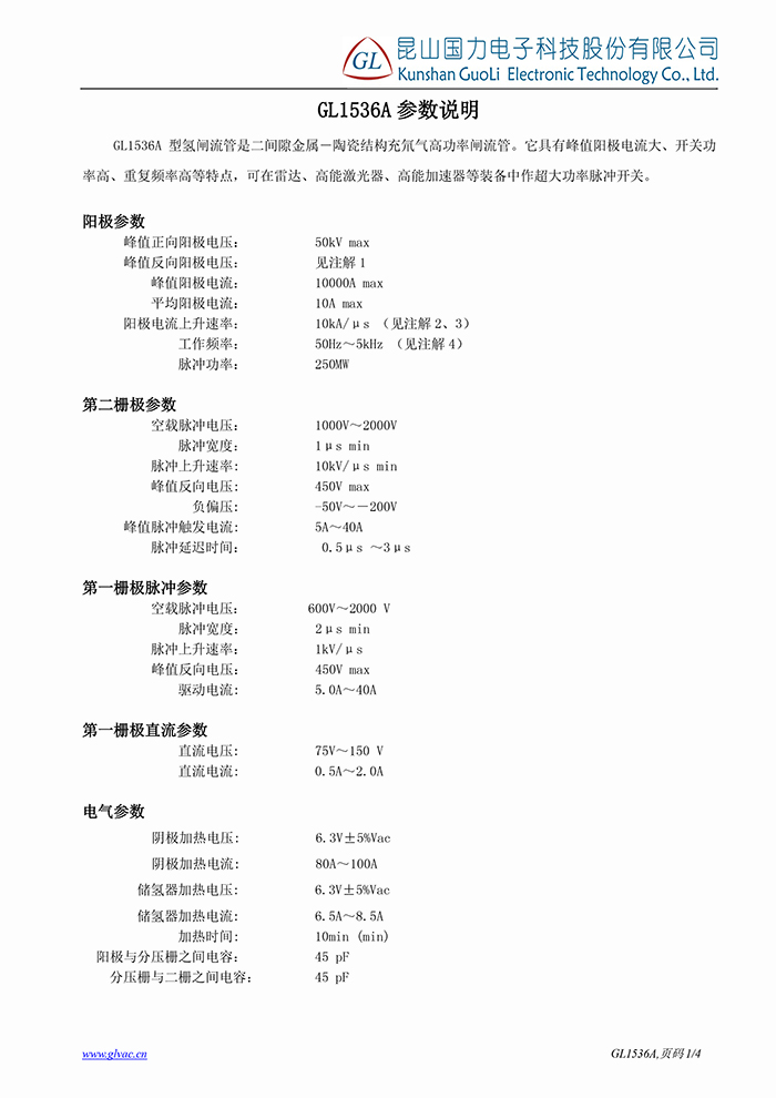 GL1536A型氢闸流管是二间隙金属-陶瓷结构充氘气高功率闸流管。它具有峰值阳极电流大、开关功率高、重复频率高等特点,可在雷达、高能激光器、高能加速器等装备中作超大功率脉冲开关。可以替换E2V公司生产的CX1536A氢闸流管