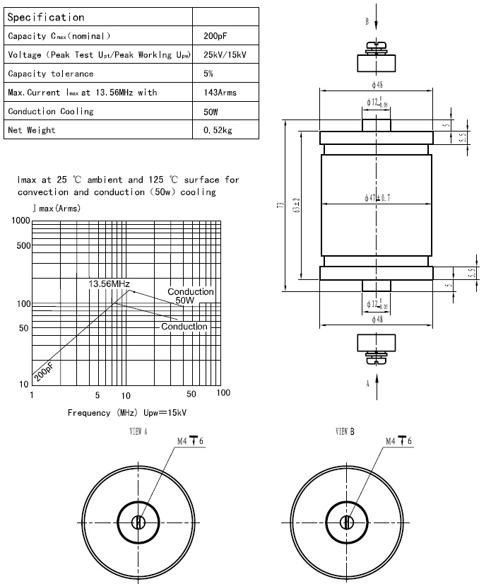 CKT200/17.5/143固定陶瓷高压真空电容器采用陶瓷外壳、真空介质、具有耐压高、体积小、Q值高、性能稳定可靠广泛用于感应加热、介质加热、通讯、广播等设备。