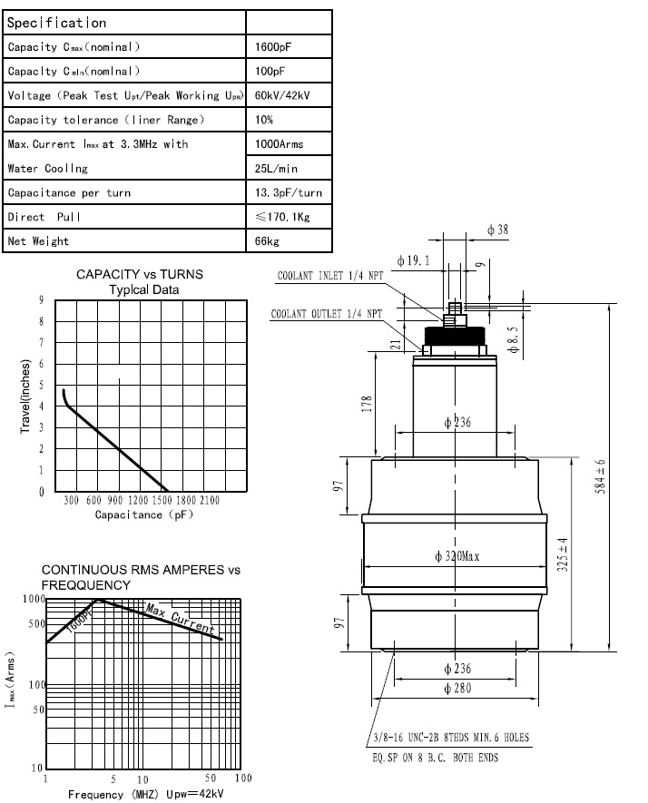 CKTBS1600/42/1000可变陶瓷高压真空电容器采用陶瓷外壳、真空介质、具有耐压高、体积小、Q值高、性能稳定可靠、价格低廉等特点,广泛用于感应加热、介质加热、通讯、广播等设备。