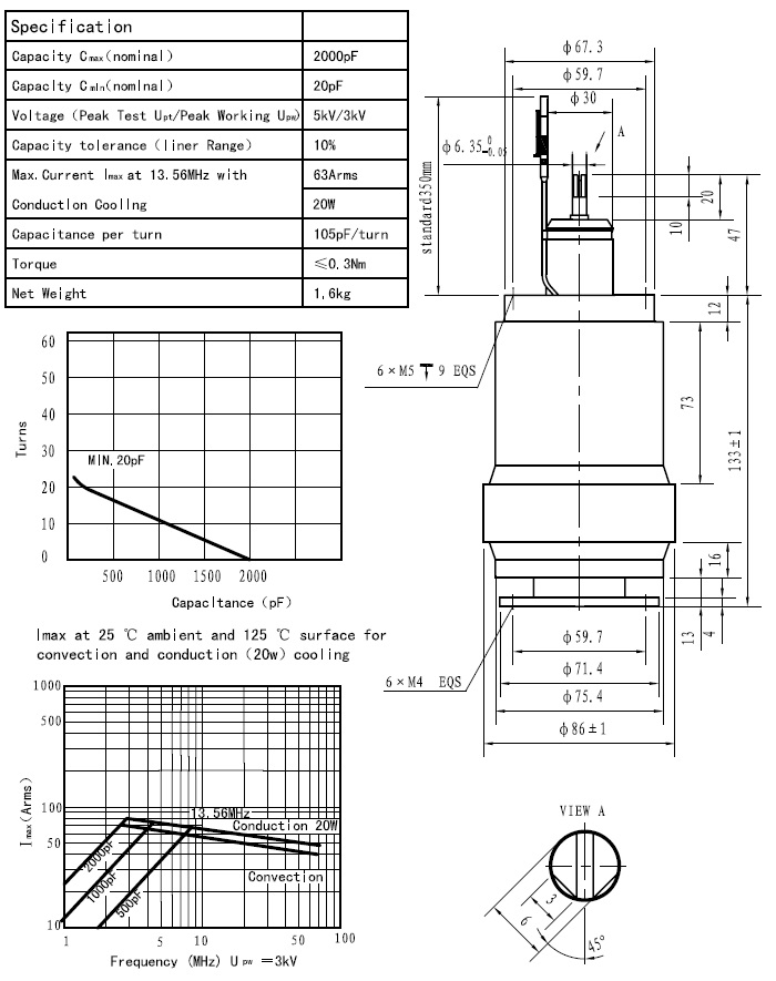 CKTB2000/3.5/63可变陶瓷高压真空电容器采用陶瓷外壳、真空介质、具有耐压高、体积小、Q值高、性能稳定可靠、价格低廉等特点,广泛用于感应加热、介质加热、通讯、广播等设备。