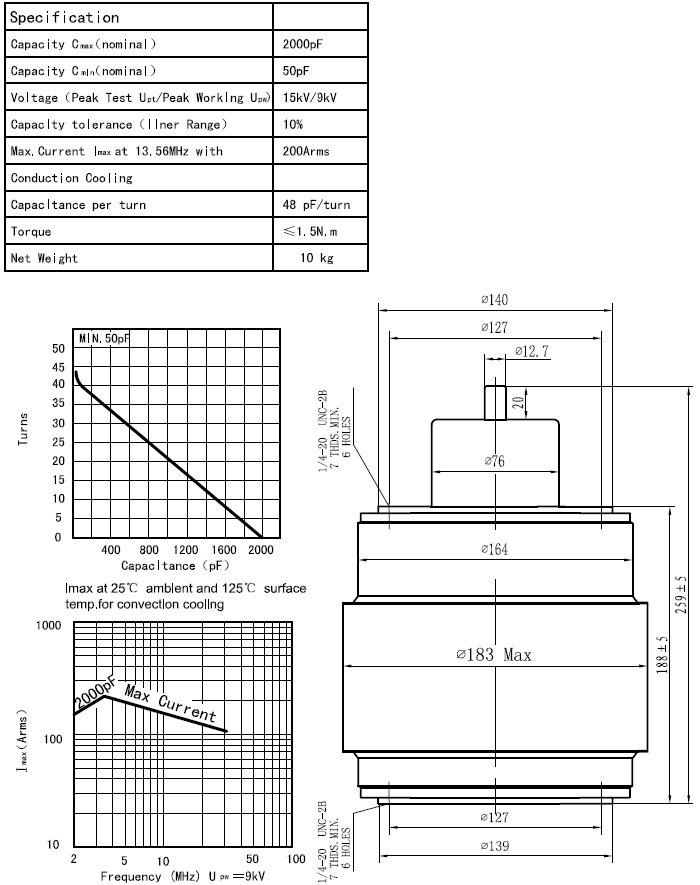 CKTB2000/10/200可变陶瓷高压真空电容器采用陶瓷外壳、真空介质、具有耐压高、体积小、Q值高、性能稳定可靠、价格低廉等特点,广泛用于感应加热、介质加热、通讯、广播等设备。