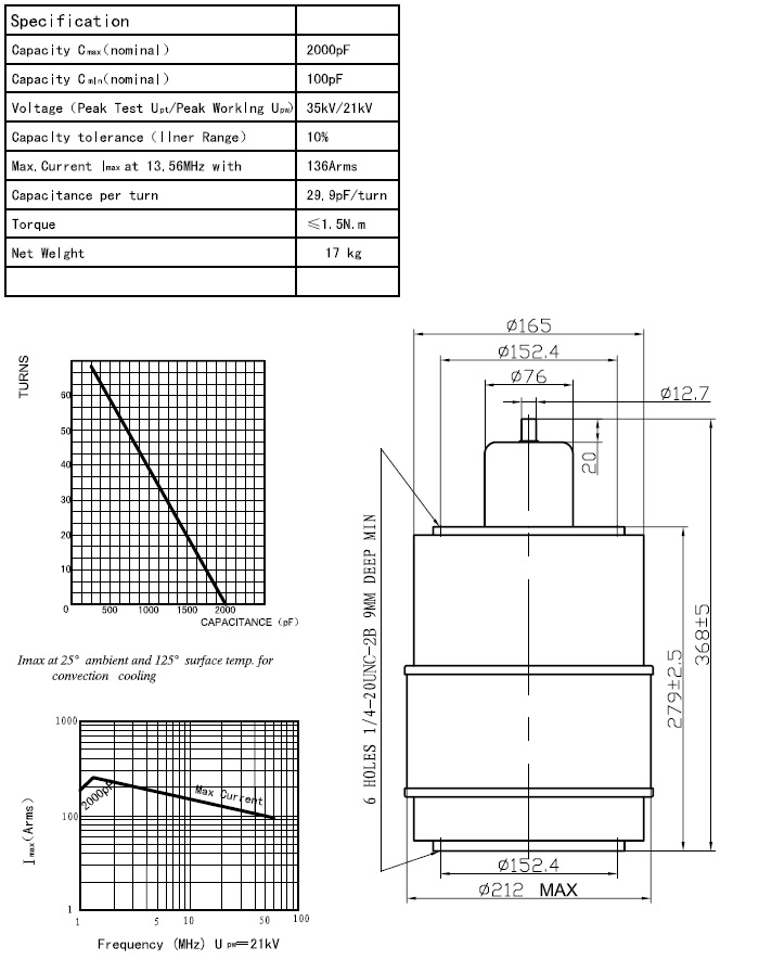 CKTB2000/25/220可变陶瓷高压真空电容器采用陶瓷外壳、真空介质、具有耐压高、体积小、Q值高、性能稳定可靠、价格低廉等特点,广泛用于感应加热、介质加热、通讯、广播等设备。