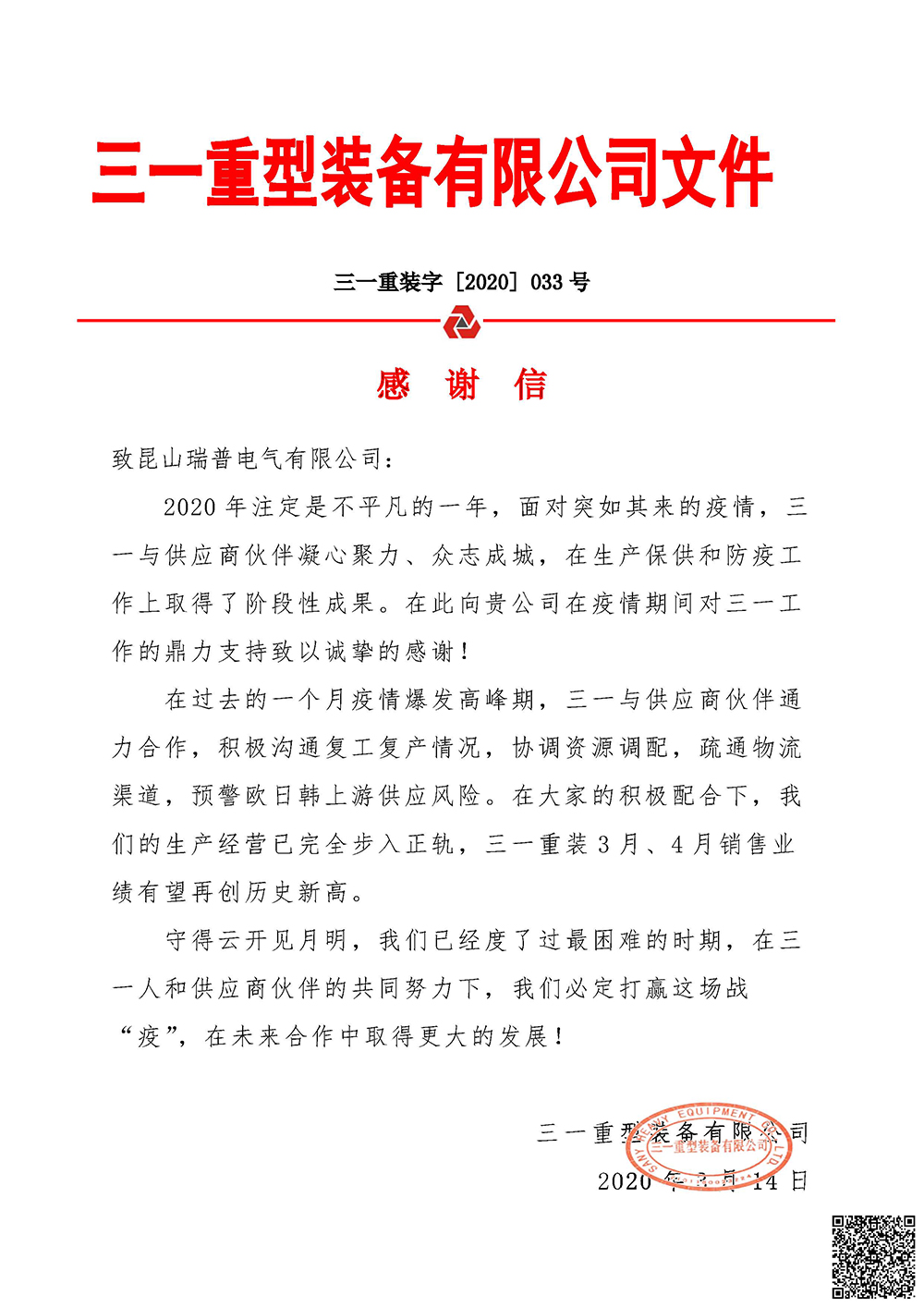 抗击疫情,温暖同行--昆山瑞普电气有限公司收到了一封来自三一重型装备有限公司的感谢信